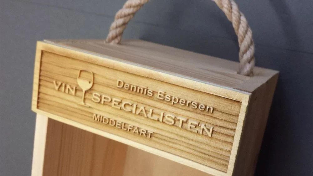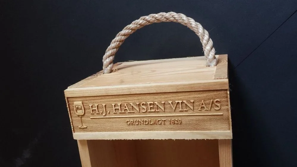 Firmalogo graveret på vinkasser