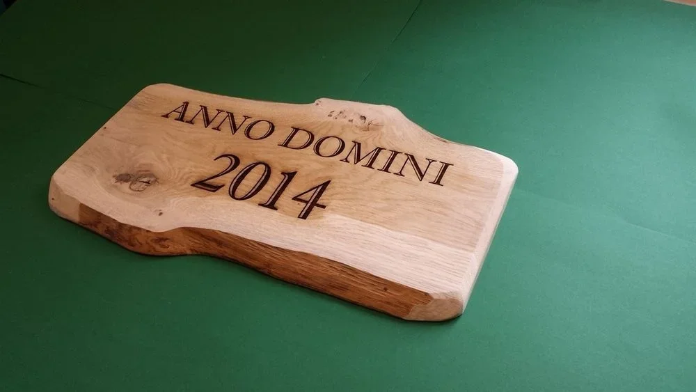 - Graveret navn på egeplanke, som mindetavle,eller box skilt.